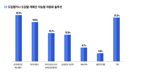 한국IDG가 현재 활용하고 있거나 도입할 계획인 RPA 솔루션을 묻는 질문에서 오토메이션애니웨어는 22.4% 점유율를 차지했다.
