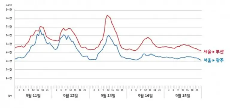 반대로 이날 부산에서 오후 1시에 서울로 출발할 경우 8시간 50분이 소요될 전망이다. 이는 평소 동시간대 평균 소요 시간 대비 3시간 20분이 더 걸리는 것이다.