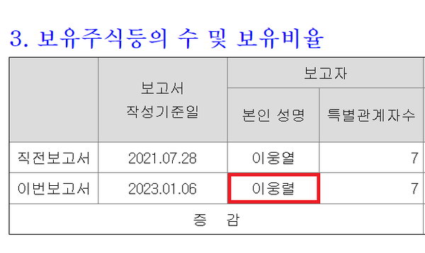 특히 1월6일 제출된 보고서에서는 위아래 칸이 '이웅열'과 '이웅렬'로 다르게 기재돼 있는 것이 눈길을 끈다. 직전 2021년 7월28일 이전으로는 이런 오기가 보이지 않는다.