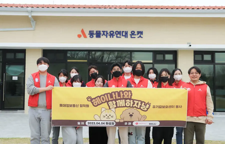 롯데정보통신이 지난 4일 유기동물 보호 캠페인을 전개했다. 행사에는 사내벤처 헤이나나 운영 팀을 비롯한 20여 명의 봉사단이 참여했다.