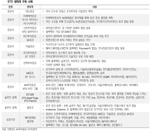 윤유동 연구원은 보고서에서 "금융당국의 토큰 증권 가이드라인 발표 이후, 증권사들은 적극적으로협의체를 만들며 STO 생태계를 구축하고 있다"며 "그 과정에서 발행사에 해당하는 조각투자 기업이 주목받고 있다"고 밝혔다.
