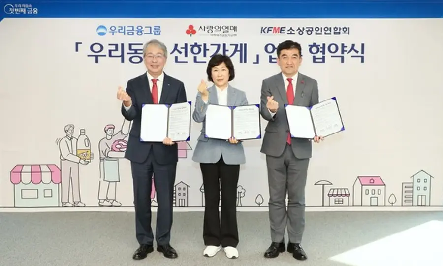 우리금융그룹(회장 임종룡)은 지역 사회에서 선(善)한 영향력을 전하고 있는 소상공인을 지원하기 위해 사회복지공동모금회, 소상공인연합회와 '우리동네 선한가게' 종합지원 업무협약을 맺었다고 6일 밝혔다.