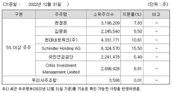 이어 투자회사 오비스 인베스트먼트 매니지먼트(Orbis investment Management Limited)가 6.61%(269만6428주)를 확보하고 있다. 오비스는 2021년11월 현대엘리베이터에 투자한 이후 그간 수차례 일부 주식을 샀다 팔았다를 반복해오고 있다.