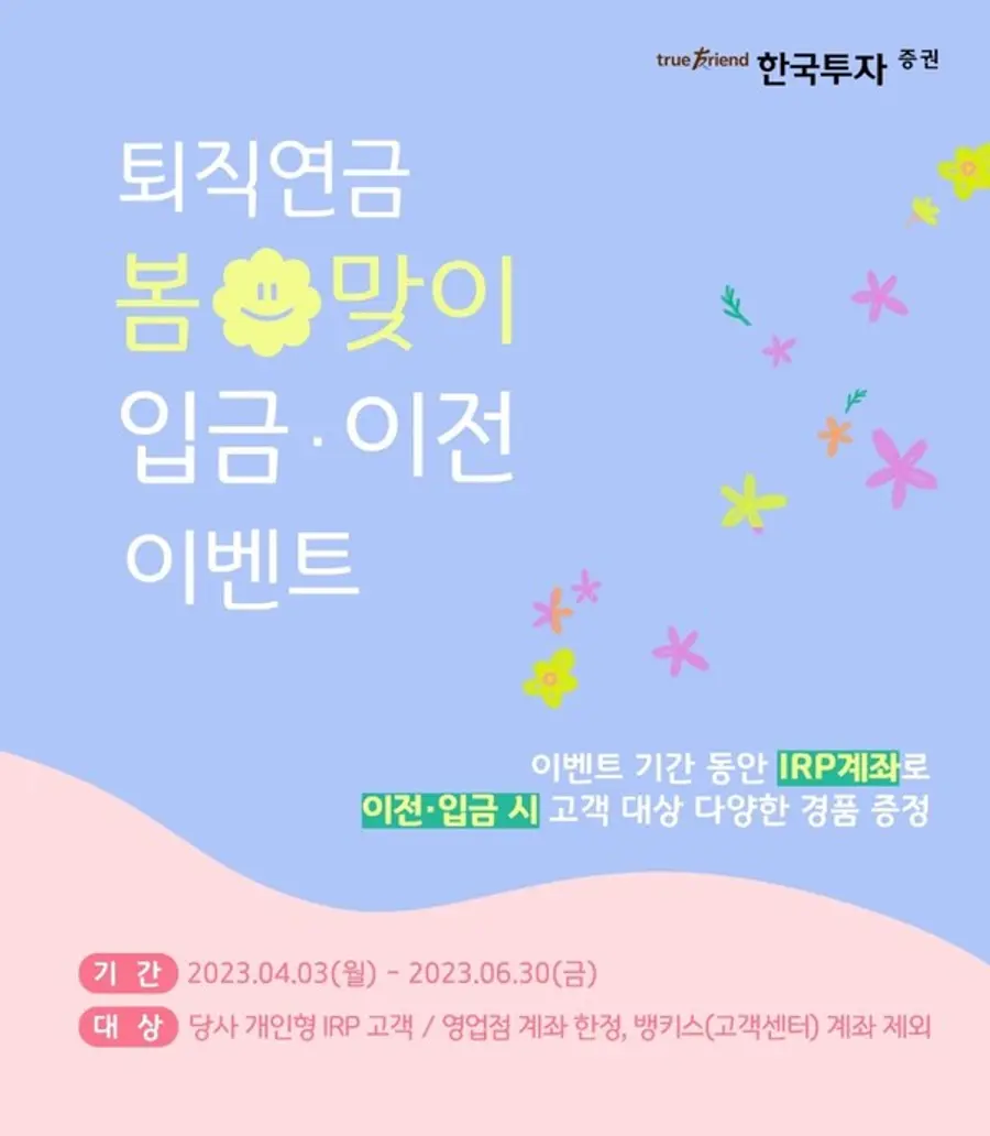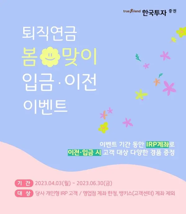 한국투자증권(사장 정일문)은 영업점 고객을 대상으로 개인형퇴직연금(IRP) 입금∙이전 이벤트를 진행한다고 7일 밝혔다.