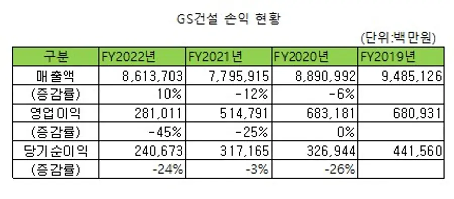 한편, GS건설의 사업보고서에 따르면 이 회사가 연루된 소송건수도 해마다 늘고 있다. 지난해 연결기업이 피소된 203건(연결기업지분 고려시 5336억원, 전체소송가액 1조3180억원)으로 1년 전 196건에 비해 소송건수가 늘었다. 이익 역시 지속적으로 뒷걸음질하고 있다.