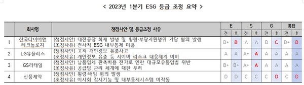 한국ESG기준원(KCGS, 원장 심인숙)은 ESG평가 등급 소위원회를 통해 이들 4개사의 ESG등급을 하향 조정했다고 밝혔다.
