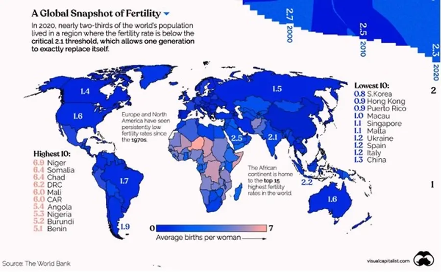세계 출산율(여성 1인당 자녀 수로 표현)은 1970년대 이후 꾸준히 감소하고 있다. 2020년 세계 출산율은 2.3명으로 여성 1인당 2.1명의 대체율을 약간 웃돌았다 . 이는 1960년 4.7에 비해 두 배 이상 떨어진 것이다.