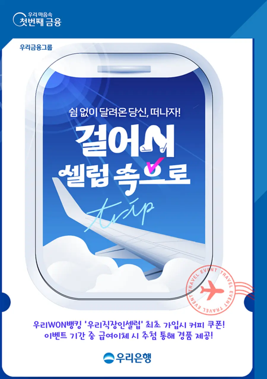 또한, 이벤트 기간 중에 우리은행 계좌로 급여를 이체한 고객을 대상으로 추첨을 통해 ▲하나투어 여행 상품권 ▲리모와 여행 캐리어 ▲국민관광 상품권 ▲코닥 일회용 카메라 ▲CU편의점 2천원권 쿠폰을 경품으로 지급한다.