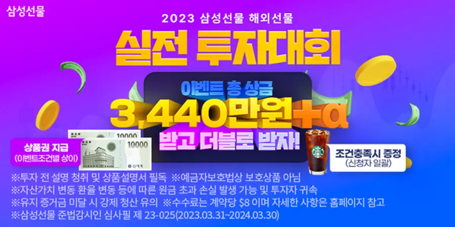 신규고객 및 최근 1년 미거래 고객은 수수료 할인 등 추가적인 혜택도 있다. 대회 신청만 해도 스타벅스 커피 기프티콘, 연말까지 CME 해외선물 수수료 할인 혜택(일반/미니 $2.5, 마이크로 $0.8)을 받고, 첫 거래 시 백화점 상품권 2만원도 지급한다.