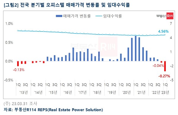오피스텔 매매가도 큰 폭으로 떨어졌다. 매매가격은 2021년 1분기 0.67% 상승하며 정점을 기록한 후 내림세를 이어오다가 2022년 4분기 하락 전환됐다. 2023년 1분기 오피스텔 매매가격 변동률은 -0.27%로 10년 내에 가장 많이 떨어졌다.