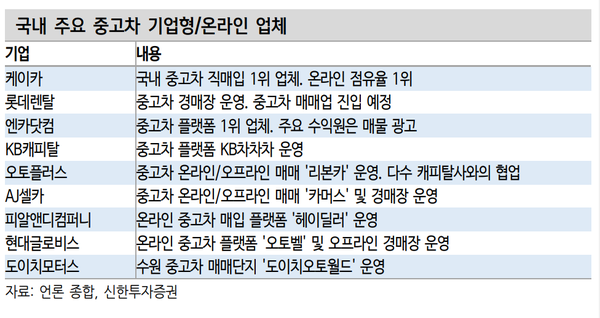 신한투자증권의 모빌리티 업종을 중고차, 렌터카, 카셰어링 업체들로 구성하고 이같은 의견을 제시했다. 종목별로는 케이카에 이어 롯데렌탈에 대해 목표주가 3만8000원에 매수 의견을, 쏘카는 의견을 제시하지 않았다.