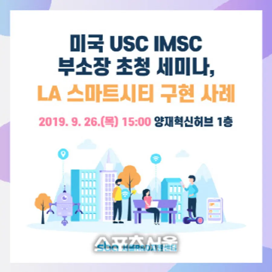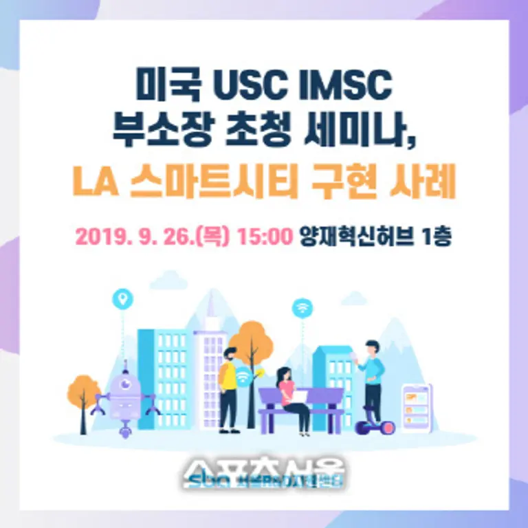 서울산업진흥원은 미국 남가주대학교(USC) 융합미디어시스템센터(IMSC) 김선호 부소장 초청해 26일 오후 3시 양재혁신허브 1층에서 스마트시티 세미나를 개최한다.100명 내외 참석가능하면 참가비 무료다.