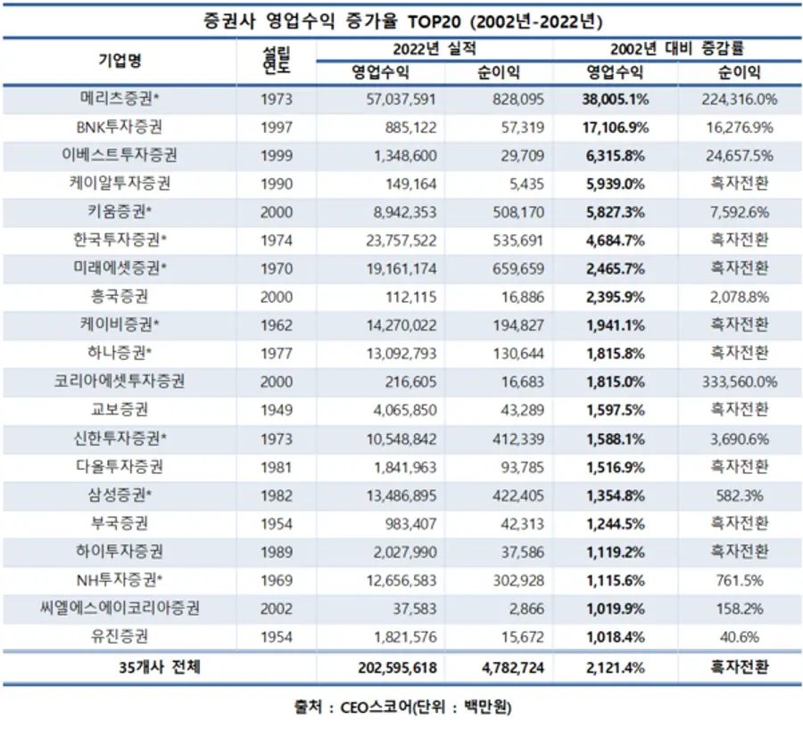23일 기업데이터연구소 CEO스코어(대표 김경준)가 2023년 금융투자협회 창립 70주년과 상장사협의회 창립 50주년을 계기로 지난 2002년부터 지난해까지 20년간 국내 증권사의 성장세를 조사한 결과 이같이 나타났다.