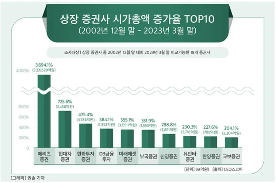 해당 기간 시가총액이 가장 많이 늘어난 상장 증권사는 메리츠증권으로 나타났다. 메리츠증권의 2002년 12월 30일 기준 시총은 988억8500만원, 2023년 3월 31일 기준 시총은 3조7517억4800만원으로 증가율은 3694.1%이다. 뒤이어 △현대차증권 725.6%(2458억2500만원↑) △한화투자증권 475.4%(4786억600만원↑) 순이었다.