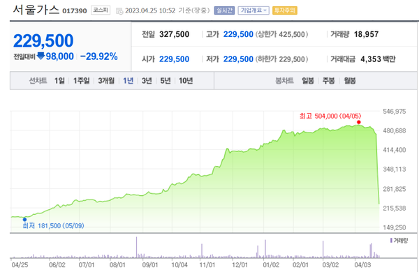 서울가스는 이틀 동안 시가총액의 51%가 허공으로 증발했다. 다만 주가는 지난해 러시아의 우크라이나 침공에 국제 천연가스 가격이 급등한 것을 전후해 본격 시작된 주가 상승 이전보다는 높은 수준이다.