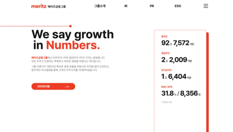 홈페이지 디자인에도 변화를 줬다. 메리츠의 CI 색상인 ‘오렌지 레드’를 활용해 기업 아이덴티티가 강조되는 수치 및 시각 자료를 배치했다. 홈페이지를 접속할 시 처음 노출되는 메인 화면에서는 ‘We say growth in Numbers’라는 문구와 함께 메리츠금융지주 실적 수치를 한눈에 파악할 수 있도록 구성했다.