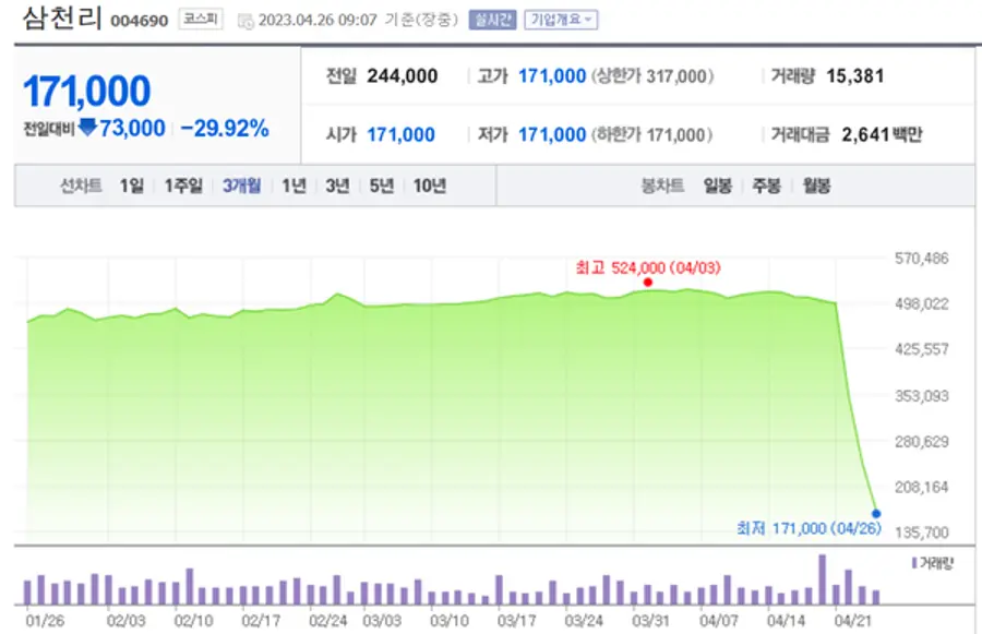26일 주식시장에서는 삼천리와 서울가스, 대성홀딩스 등 3개 도시가스 주와 선광, 세방 주가가 가격제한폭까지 떨어진 채로 거래를 시작했다.