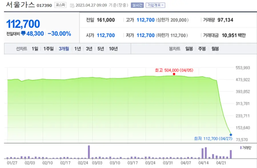 27일 오전 9시4분 현재 서울가스, 대성홀딩스, 선광이 일제히 하한가에서 거래를 시작했고 여전히 하한가에 머물러 있다. 전일까지 사흘 연속 하한가를 기록했던 삼천리는 하한가에서 탈출했다. 다만 하락률은 20%를 넘고 있다.