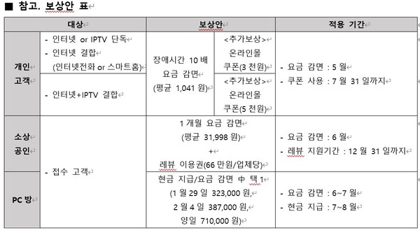 개인고객 427만 여명에게 장애시간 대비 10배를 기본 보상한다. IPTV 단독, 인터넷 단독, 인터넷 결합(IPTV, 인터넷전화, 스마트홈) 서비스를 이용하는 개인 가입자 등이 보상 대상이다. 고객별 5월 청구 요금에서 자동 감면된다.