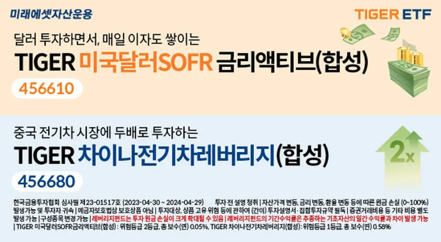 미래에셋자산운용은 한국거래소에 ‘TIGER미국달러SOFR금리액티브(합성)’와 ‘TIGER차이나전기차레버리지(합성)’ ETF 2종을 신규 상장한다고 9일 밝혔다.