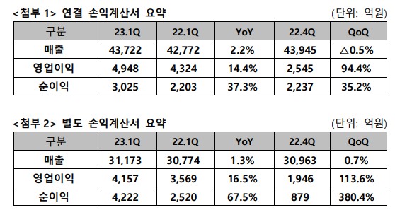 별도 재무제표 기준 1 분기 매출은 3 조 1173 억원, 영업이익 4157억원을 기록하며 전년 동기 대비 각각 1.3%, 16.5% 성장했다.