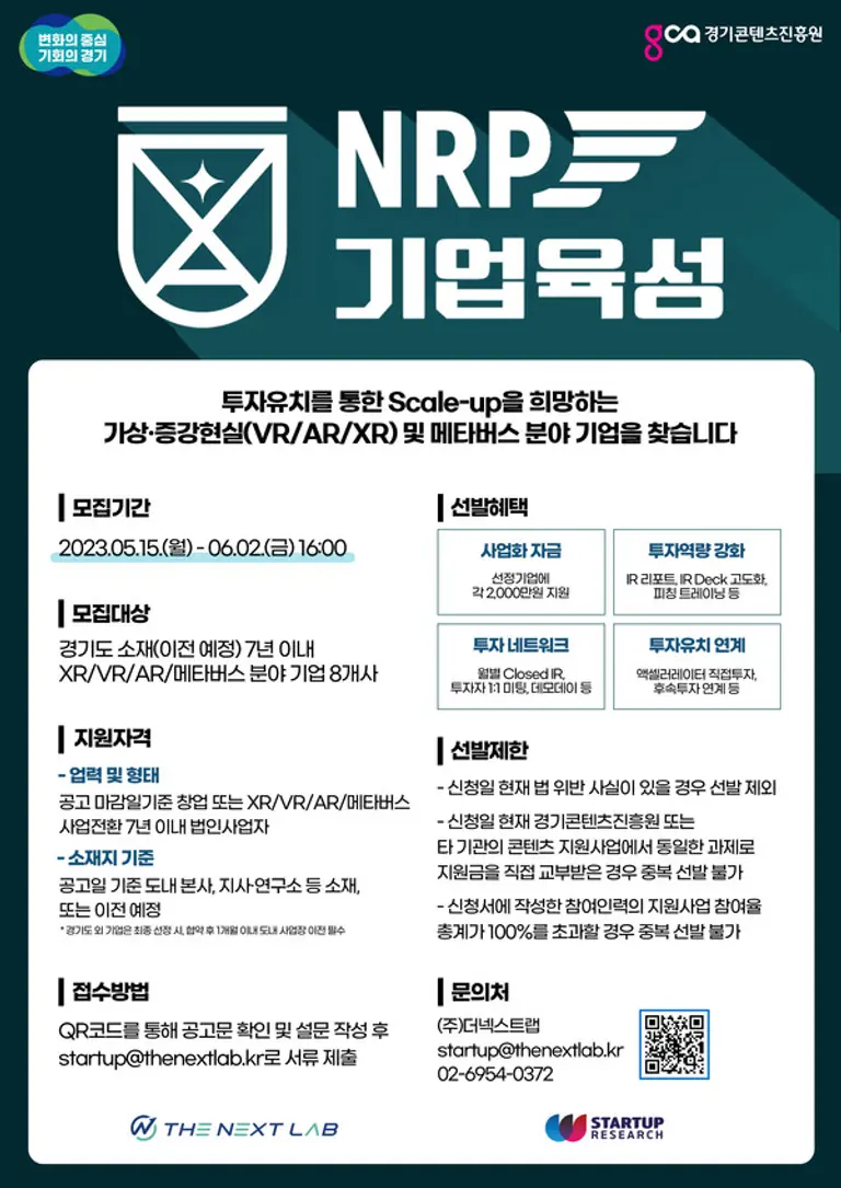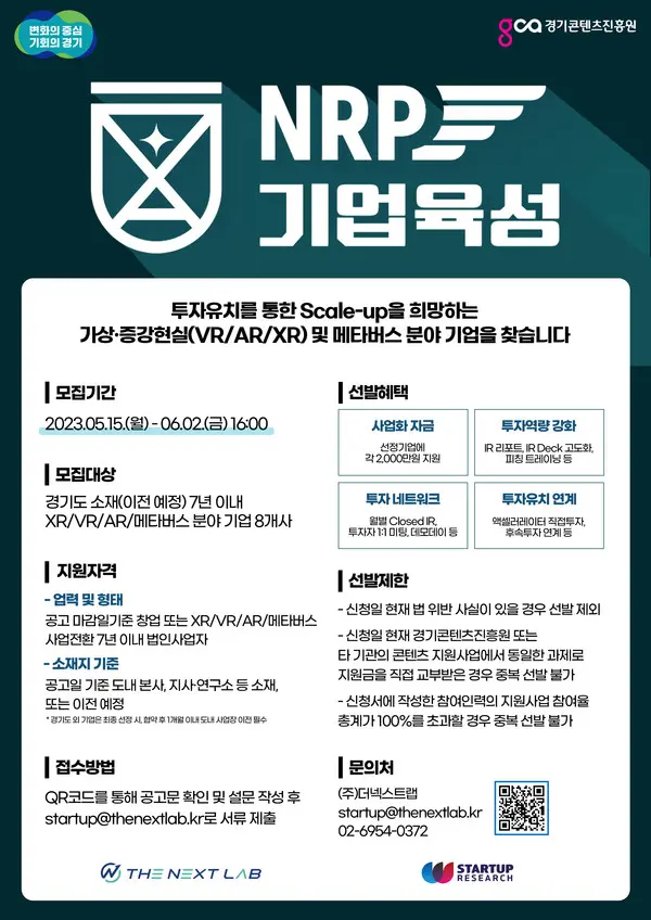 스타트업 액셀러레이터 더넥스트랩은 경기도가 주최하고 경기콘텐츠진흥원이 주관하는 ‘2023 NRP 기업육성 액셀러레이팅 프로그램’에 참여할 스타트업을 모집한다고 15일 밝혔다.