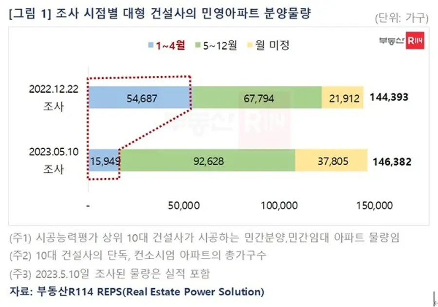 지난달까지 10대 건설사의 공급 물량은 작년말 계획분 5만4687가구의 29%인 1만 5949가구에 달한다. 연초 냉랭한 분양 시장과 규제 완화 시점 등에 따라 분양 일정을 일부 연기한 것으로 풀이된다. 특히, 미분양 리스크가 큰 지방에서의 분양 계획을 주저하는 분위기가 역력하다.