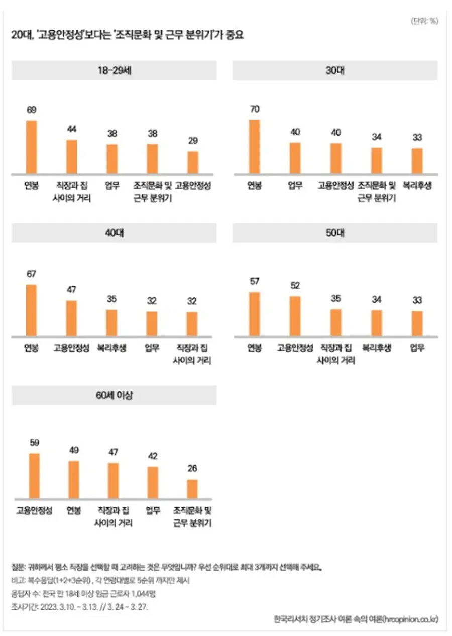 반면 20대는 연봉(69%), 직장과 집 사이의 거리(44%), 업무(38%), 조직문화 및 근무분위기(38%) 순으로 꼽았다. 60대가 최우선 조건으로 꼽은 고용안정성은 아예 순위내에 들지도 못했다.