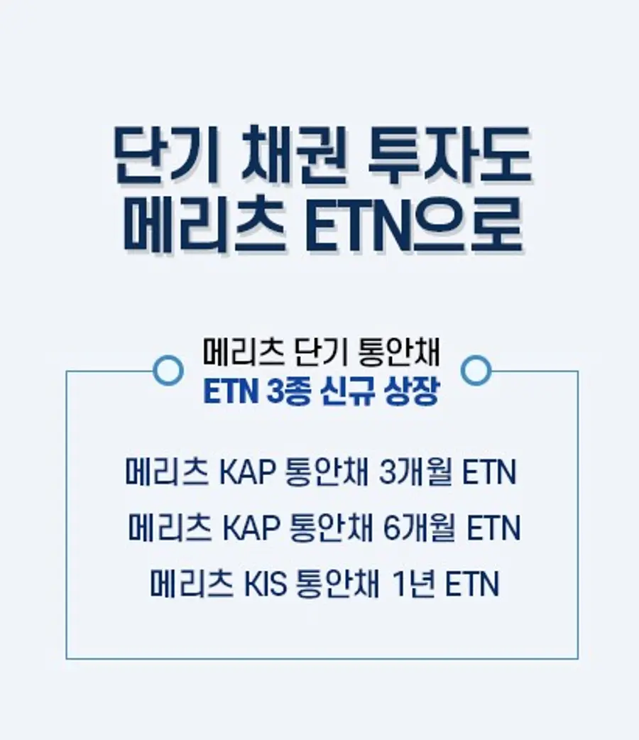 신규 상장 종목은 ▲메리츠 KAP 통안채 3개월ETN ▲메리츠KAP 통안채 6개월 ETN▲메리츠 KIS 통안채 1년ETN으로 각각 한국은행에서 발행하는 통안채 중 잔존 만기가 약 3개월, 6개월, 1년인 3개채권으로 기초지수가 구성되어 있다. 기초지수는 KAP 한국자산평가와KIS 자산평가에서 산출하며, 매달 기초자산 구성 종목이해당 종목의 만기에 맞게 재편된다.