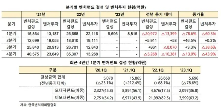 글로벌 경기불안이 지속되면서 벤처투자업계에 심각한 가뭄이 이어지고 있다. 지난 1분기 벤처펀드결성은 전년동기대비 78.6% 줄고, 신규투자액 역시 60.3% 감소했다.
