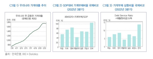 30일 한국금융연구원(이지언 선임연구위원)이 발표한 <국내은행 가계대출 리스크 예측> 보고서에 따르면 우리나라 전 금융권 가계대출은 2010년이후 2021년까지 연평균 8%로 급격하게 증가해왔다. GDP대비 가계부채비율은 미국, 일본 등 주요국의 경우 80% 이하 수준인데 반해 우리나라는 100%를 상회하고 있다.