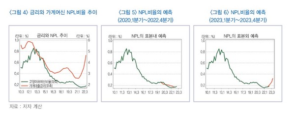 국내은행의 가계대출 고정이하여신비율(이하 'NPL비율')과 금리 변동과의 상관관계를 분석한 결과, 금리가 상승·하락하고나서 3분기 이후 뒤늦게 NPL 비율도 상승·하락하는 등의 경향이 나타났다.