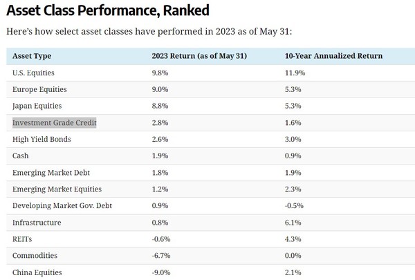 7일 글로벌데이터인포그래픽업체 비주얼 캐피탈리스트(Visual Capitalist)가 전세계 최대운용사인 블랙록(BlackRock) 데이터를 사용해 분석한 주요 자산별 수익률에서 미국 주식이 올들어 가장 많이 오른 것으로 조사됐다. 이번 조사는 5월31일을 기준으로 산정한 주요 자산군별 수익률 데이타이다.