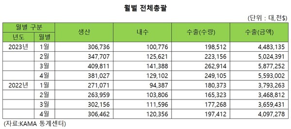 7일 한국자동차모빌리티산업협회(KAMA, 회장 강남훈)에 따르면 지난 1월부터 4월까지 국내 자동차 주요업체들의 생산물량은 144만5281대로 전년 동기 대비 26.4% 증가했다. 내수 판매차량은 49만6887대, 수출이 93만3687대로 전년동기 대비 각각 15.5%와 29.6% 증가했다.
