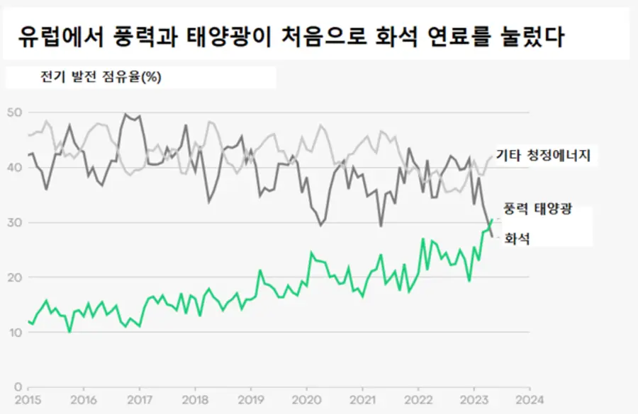 1월에 발표된 엠버의 유럽전기리뷰(European Electricity Review)에서는 풍력과 태양광 발전이 지난 해 EU에서 가스를 추월했다고 밝혔다. 이제 풍력과 태양광은 한 달 동안 모든 화석 연료를 합친 것보다 더 많은 것을 생산했다.