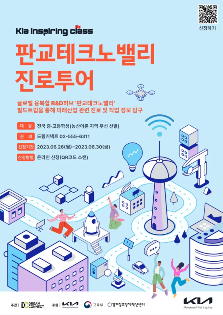 기아는 전국 중·고등학생을 대상으로 진행하는 '기아 인스파이어링 클래스 – 판교테크노밸리 진로투어' 참가자를 이달말까지 모집한다고 26일 밝혔다.