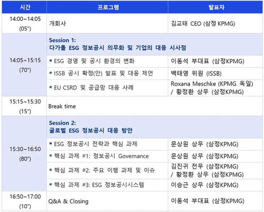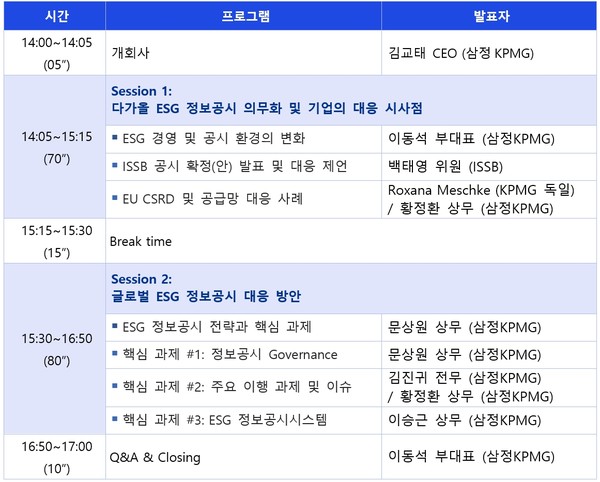 첫 번째 세션은 삼정KPMG 이동석 부대표가 ESG 경영 및 공시 환경의 변화를 설명한다. 이어 ISSB 백태영 위원(성균관대 경영학과 교수)이 ISSB 공시 확정안을 발표하고 기업 대응 방안을 제언한다. KPMG 독일의 ESG 담당 파트너인 록사나 메슈케(Roxana Meschke)가 유럽의 실제 ‘기업 지속가능성 보고 지침(CSRD)’ 공시 준비 상황 및 공급망 대응 사례를 소개한다.