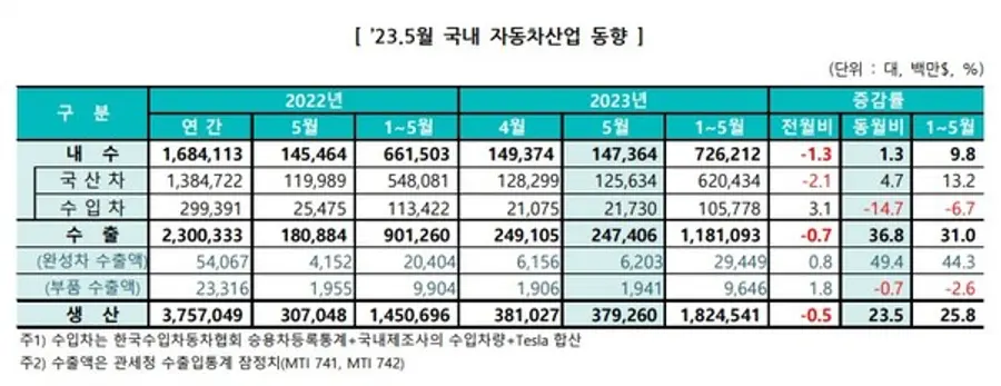 5월 내수는 생산량 증가와 함께 대기수요가 해소되며 전년동월대비 1.3% 증가한 14만 7374대를 기록했다. 국산차가 4.7% 증가한 반면 수입차는 14.7% 감소했다.