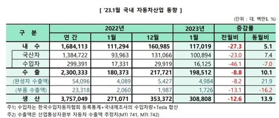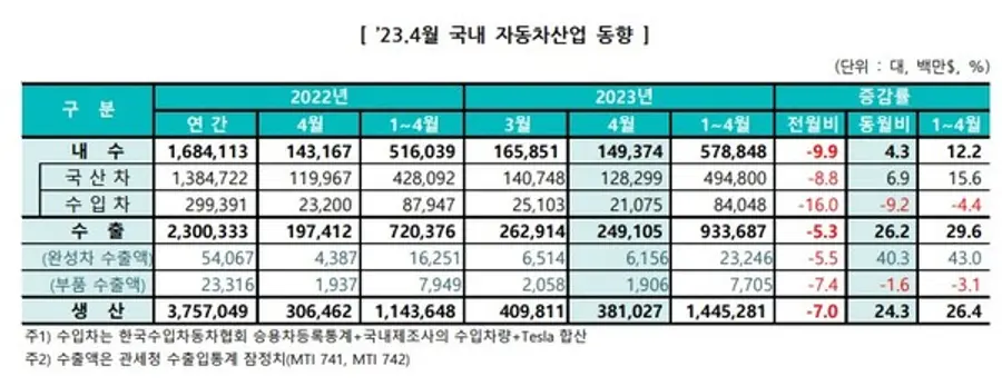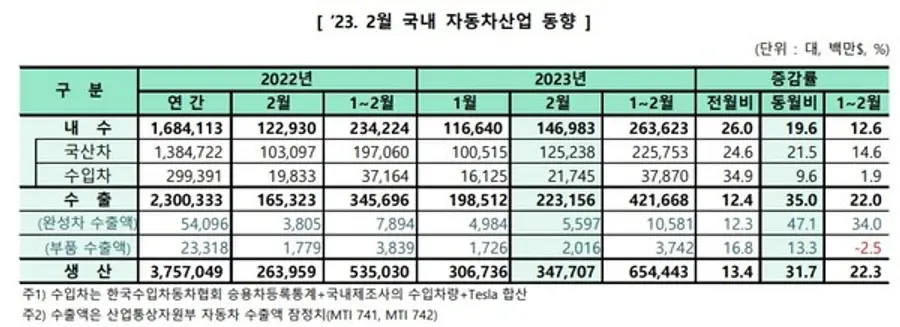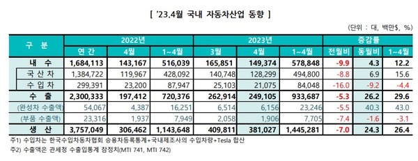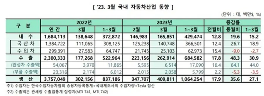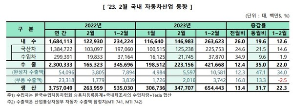 생산은 견조한 글로벌 수요와 수출 물량 증가에 따른 생산 확대로 전년동월 대비 23.5% 증가한 37만9260대를 달성했다. 해외생산은 지난해 글로벌 공급망 차질의 기저효과와 더불어 중국, 브라질 등의 생산이 회복세를 되찾으며 전년동월 대비 10.5% 증가한 30만4570대를 기록했다.
