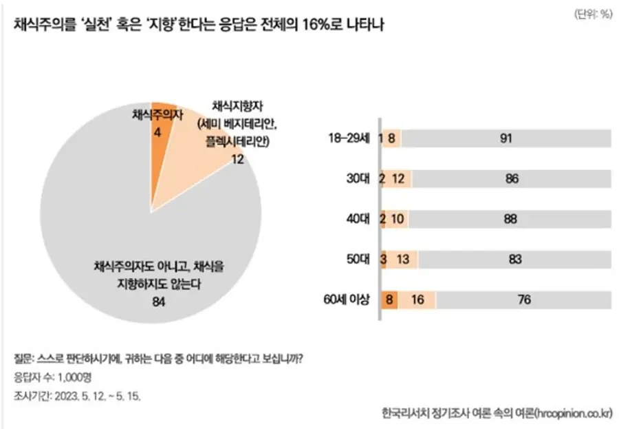 한국리서치 <여론 속의 여론>팀이 지난달 12일부터 15일까지 전국 만 18세 이상 남녀 1000명을 대상으로 채식과 대체육에 대한 조사를 진행한 결과, 이미 채식주의를 실천 혹은 지향하고 있다는 응답은 16%로 조사됐다.