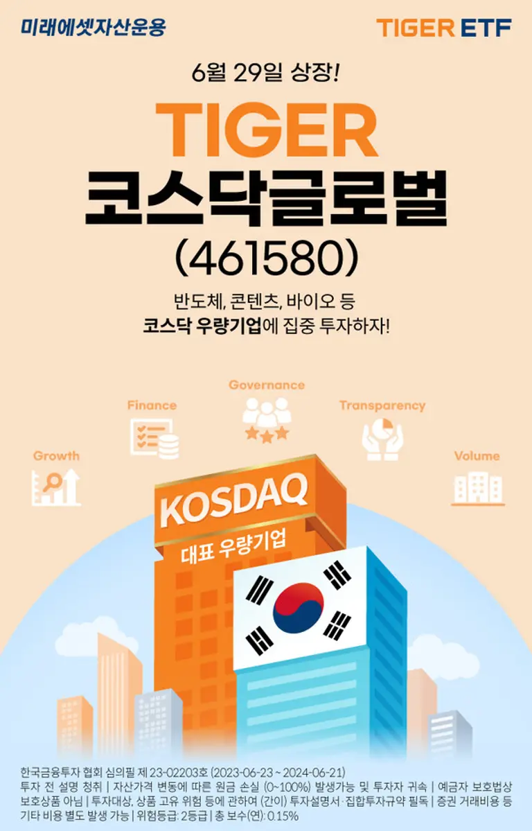 미래에셋자산운용 ETF 운용부문 신승우 매니저는 “나스닥 시장을 이끄는 애플, 구글, 아마존처럼 코스닥에도 글로벌 수준의 기술력과 경쟁력을 가진 기업들이 있다”며 “시장평가, 재무실적, 연구실적까지 두루 갖춘 코스닥 우량 기업에 투자하고 싶다면 TIGER코스닥글로벌 ETF를 주목할만하다”고 말했다.
