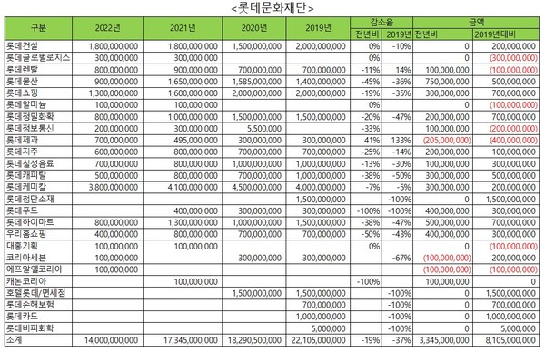 29일 국세청 공익법인공시시스템에 공시된 롯데문화재단의 2022년도 결산공시자료에 따르면 롯데문화재단이 계열사로부터 받은 기부금 수익은 140억원으로 1년만에 계열사 기부금액이 33억원 감소했다. 다만 재단이 보유중인 계열사 주식(롯데케미칼, 롯데칠성음료(우), 코리아세븐, 롯데쇼핑, 롯데지주(우), 롯데지주, 롯데상사)에 따른 배당수익은 2억8261만2800원으로 1년전에 비해 1억원 가량 늘었다. 2021년도 배당금 수익은 1억8746만3020원이었다. 배당이 늘었지만, 계열사들이 해마다 현금으로 기부한 액수가 줄면서 재단의 사회 공헌 활동도 이전에 비해 소극적이다.