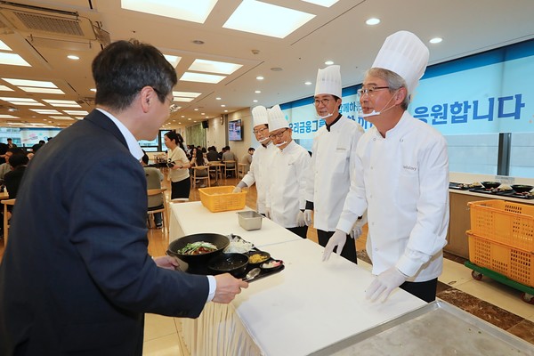 식당 이용이 아닌 서빙을 위해서였다. 본점 식당을 운영하는 삼성 웰스토리 로고가 박힌 요리복을 입고, 캡에 투명 마스크, 위생장갑까지 착용한 이들. 점심을 위해 들어온 직원들에게 점심 메뉴로 준비된 장어덮밥을 직접 나눠주면서 눈을 맞췄다. 구내 식당에서 보양식 장어덮밥을 보기란 흔치 않은 일이었단다.