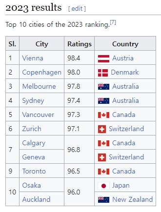 비엔나에 이은 2위는 덴마크의 수도 코펜하겐이 차지했고, 코로나19 대유행 이후 정상 생활로 전환한 호주 멜버른과 시드니가 3위와 4위로 복귀했다. 두 도시는 2022년 순위가 급격하게 하락했지만 이번 조사에서 원위치로 다시 올라섰다.