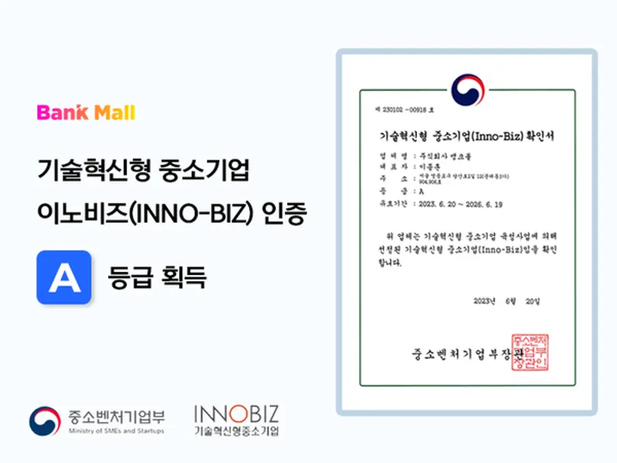주택담보대출 플랫폼 뱅크몰이 중소벤처기업부에서 주관하는 기술혁신형 중소기업 인증 ‘이노비즈 A등급’을 획득했다고 3일 밝혔다.