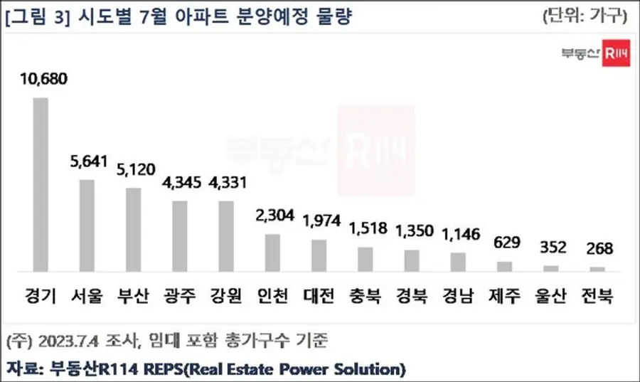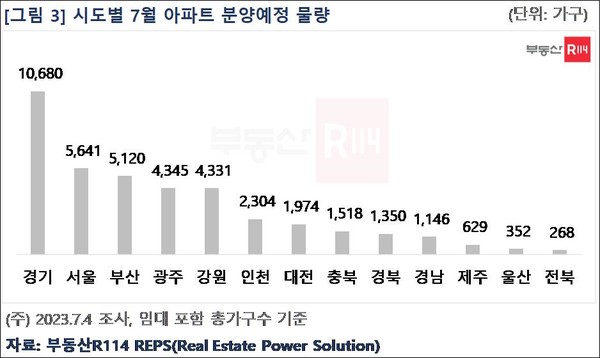 시도별 7월 분양계획 물량은 △경기 1만 680가구 △서울 5641가구 △부산 5120가구 △광주 4345가구 △강원 4331가구 △인천 2304가구 순이다.