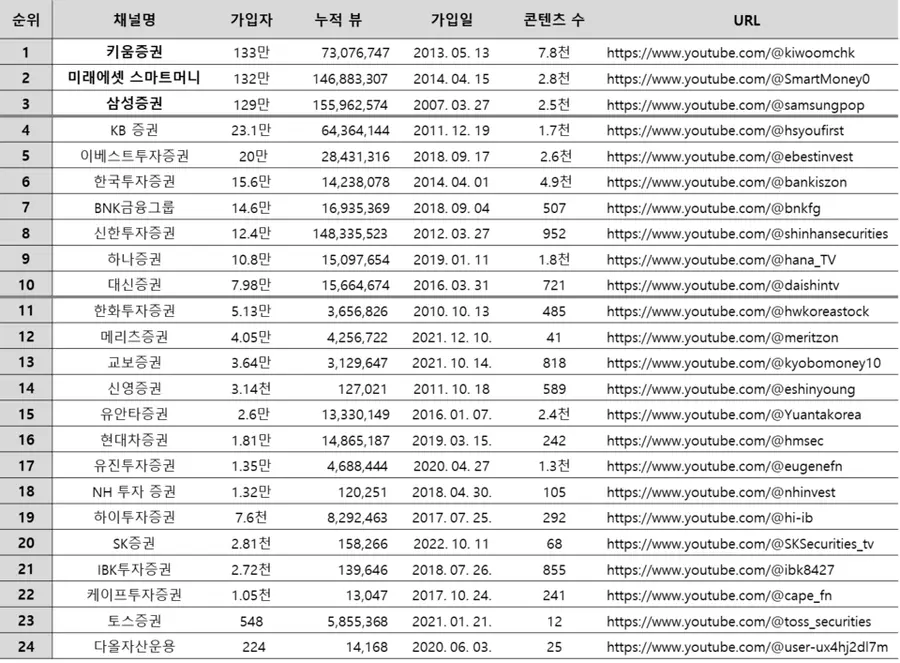 KB증권(23만), 이베스트투자증권(20만), 한국투자증권(15.6만명), 신한투자증권(12.4만명), 하나증권(10.8만명)에 그친다. 대신증권(8만), 한화투자증권(5.1만),메리츠(4만), 교보증권(3.6만명), 유안타증권(2.6만명), 현대차증권(1.8만), 유진투자증권(1.35만) 등이 그나마 1만명을 넘겼을 뿐 나머지 하이투자, 신영, SK증권, 케이프투자증권, 토스증권, DB투자증권은 사실상 유튜브 계정만 열어둔 개인 유튜브 계정보다 구독자수가 열세를 보이고 있다.