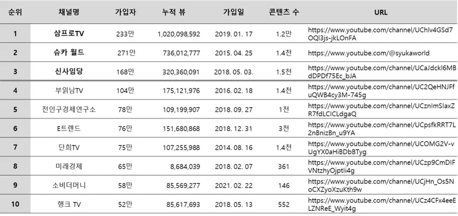 증권사가 아닌 일반 증권관련 유튜브 채널 운영자 중에서는 슈카월드(271만명), 삼프로TV(233만명)으로 압도적 우위를 기록중이다. 이어 신사임당(168만), 부읽남TV(104만명)가 뒤를 잇고 있다. 슈카월드는 2015.4월 개설돼 누적페이지뷰수(7353만)으로 2019년1월 시작한 삼프로TV 페이지뷰수(1조200만뷰)에 비해서는 뒤쳐졌다. 삼프로TV가 후발사업자의 열세를 딛고, 최근 투자자들의 호응을 얻고 있는 것으로 보인다.