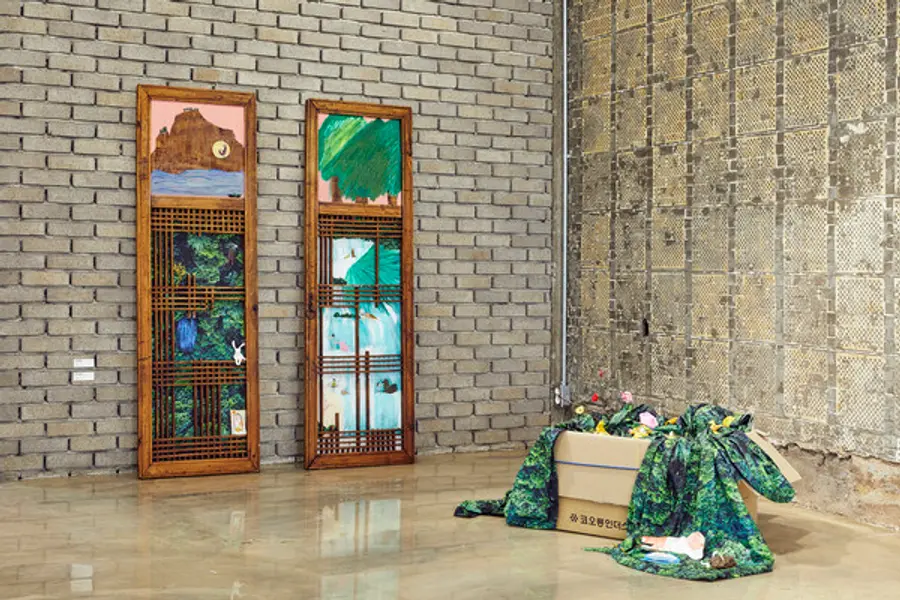 9월 20일까지 열리는 이번 전시는 말린 꽃을 그림의 재료로 사용해 '꽃그림' 작가로 이름난 백은하씨와 함께 한다. 꽃·과육·유화·자연염료 등 색을 표현할 수 있는 다양한 재료를 활용한 회화 5점과 조형물 2점 등 총 7점이 전시된다. 코오롱스포츠 판초우의 재고를 활용해 숲을 표현한 조형물이 눈에 띈다.