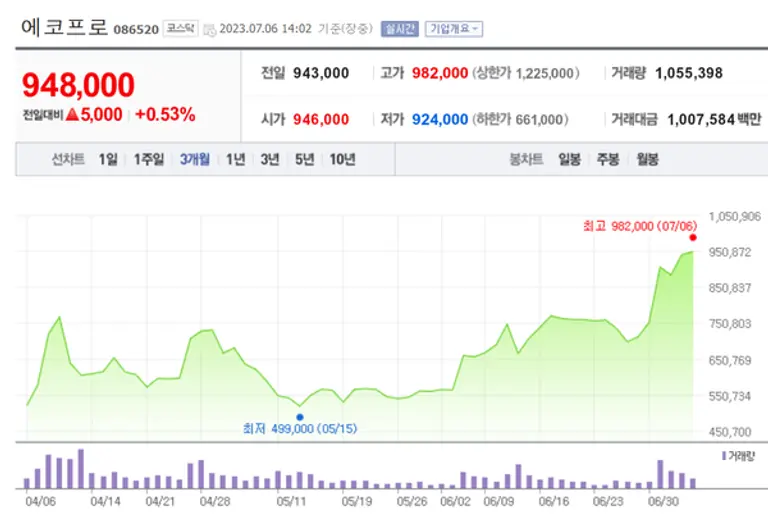 특히 공매도 파산설이 돌 정도로 에코프로의 주가가 급등하는 시기와 맞물리면서 해당 ETF에 대한 관심도 있는대로 높았다. 6일 오후 1시56분 현재 코스닥지수가 1.82% 하락한 875.15포인트로 약세를 보이는 가운데서도 에코프로는 1% 안팎 상승세로 건재를 과시하고 있다. 이날 한 때 98만2000원까지 오르며 나흘 연속 사상최고가 행진을 벌였다.
